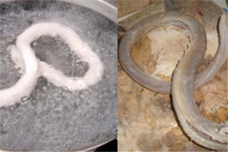 第二步,把搓洗后的牛鞭用热水冲洗干净,再用剪刀把牛鞭的外皮剪开撕去,去皮过后用开水再冲洗一次。另外起一口锅,在锅中放入适量的水,切一些葱、姜和花椒进去,等水烧开后把牛鞭放进去。
