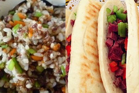 葱花和胡萝卜、豆角切丁,酱驴肉也切丁。然后往煮熟的米饭里倒入少许水或者少许白醋拌一拌。