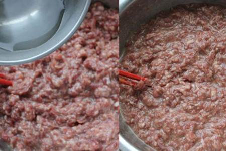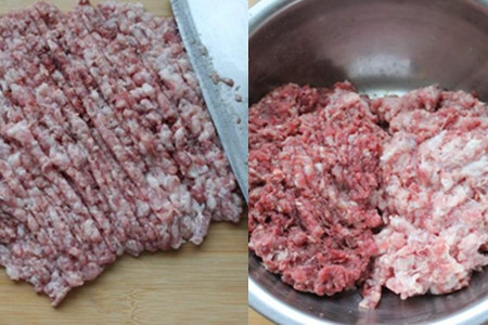 3.五花肉洗净也剁成肉馅,将驴肉馅和五花肉馅混合在一起,搅拌均匀。