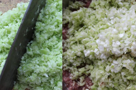 5.萝卜洗净削皮,擦成萝卜丝,再剁成细末。取出冷藏好的肉馅,将萝卜细末挤干水分后加入肉馅中,调入2勺十三香和葱姜末,搅匀,制成包子馅待用。