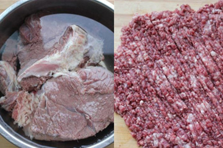 2.驴肉清洗干净,放清水里泡一夜,把驴肉的血水泡出来。将泡好的驴肉切成块状,再剁成肉馅。
