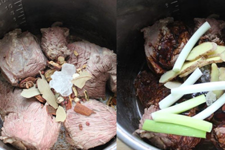 驴肉洗净放入清水中泡一个上午,这样能更好地泡出驴肉中的血沫。驴肉冷水下锅煮制,能更好地将驴肉中的血沫煮出来。驴肉肉质比较硬,所以用高压锅来炖煮,比较省时间,要比用普通的锅省一半时间。八角、花椒、香叶和山楂等香料样样都要备齐,这样炖出来的驴肉才香。