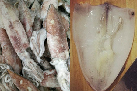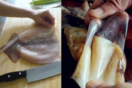 鱿鱼背部的表皮上会有一层保护膜,大家要把它清除干净,因为这一层保护膜是有毒性的。如果不清除掉炒菜的时候会影响菜的味道。鱿鱼背部的表皮要从大的那头开始慢慢扯干净。去除去出完表皮的鱿鱼会变得特别白白净净。