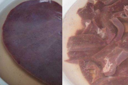 还有一种就是,如果你急着要煮的话,那可以将猪肝切成小块,然后也是在盆中抓洗一下,当然切成小块再泡也是可以的。这里还是要强调一下水要完全浸没猪肝。好好地清洗猪肝也是去腥的第一步。
