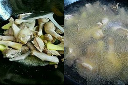 这时热锅中倒入油,倒入鸭肉爆炒出香味,加入料酒,然后放入姜片炒香,直到鸭肉出油紧缩、体积随之变大后,向锅中加进清水淹没鸭肉,盖上盖子,开大火煮。