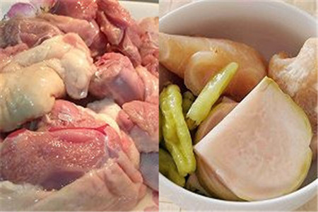 这道菜所需的鸭肉必须是老鸭,这样炖出来的汤才够味。准备一只或者半只鸭,斩成小块洗干净后装进碗中,捞出一些酸萝卜或者其他泡菜备用,依旧是要腌制很久的才行。