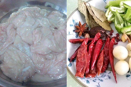 第一, 事先购买好新鲜的猪大肠,以及干辣椒、大蒜、香叶、青椒等材料。把大肠浸泡在水里一段时间,并用盐清洗多几遍。