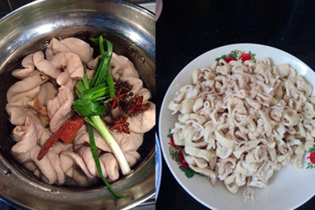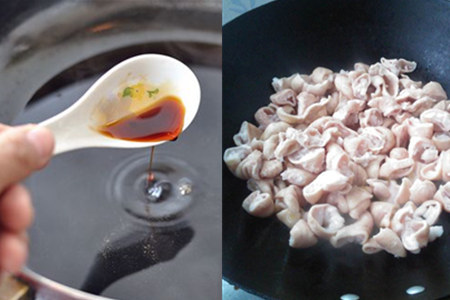 第三, 调制酱汁:把糖、醋、盐、淀粉等兑成酱汁备用。另一边,起锅入油烧热,将肥肠下锅煸炒一会儿。