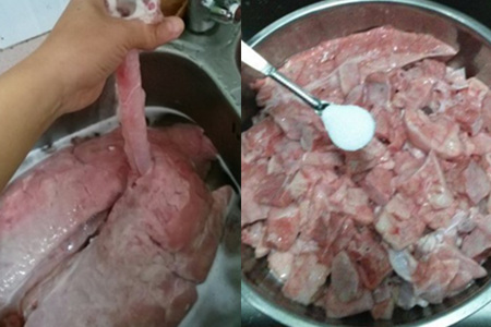 首先是把猪肺的开口放到水龙头下面充满水,然后把猪肺放到注满水的水池里面,用手或者锅铲之类的使劲挤压拍打猪肺,直到里面的血水全部散发出来。这个过程要反复多次,直到水池里的水逐渐清澈为止。