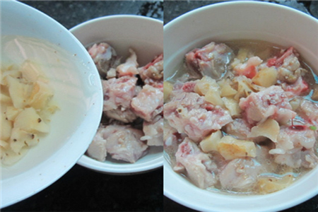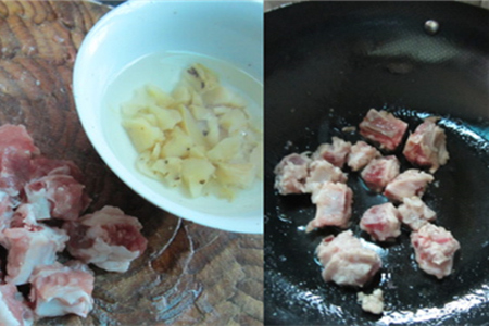 然后我们将天麻切好放在水中洗干净,再将排骨切成一小截的,之后将排骨放在锅中的开水中,将血水清理干净,在锅中放上油,将排骨放在锅中轻轻的炸一下,只是为了要有一个油香味,不要炒熟了。