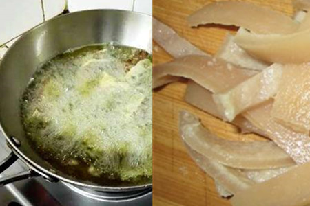 我们可以把制作好的猪皮、油一同放进锅里进行油炸,炸成金黄色的样子就可以了,然后我们把它捞出来,可以等它凉了,就把它放进冰箱,要用的时候再用开水泡它,它就会软软的了,接着把它捞出来制作美食就行。