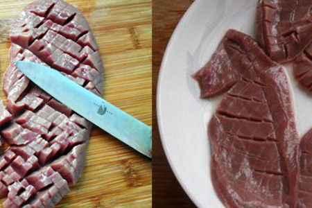 等你把猪腰里外都弄干净,我们就开始切了,其实切猪腰,想要弄成花的形状很容易,就像我们切芒果一样的操作。在它的表面划上几刀,随意就行,如果想要好看点,就需要慢慢来,横竖交叉切要注意它们的规格大小,如果切成一处大一处小不均匀就不美观了。