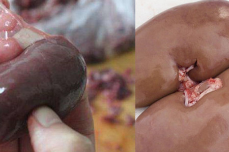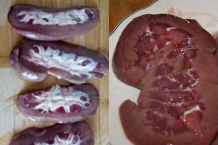 我们把猪腰表膜撕出来后就开始把它切半,进行里面的操作了。首先切开一半后,你会发现里面有一些白色的筋,你要用刀子把它切干净。如果弄不干净骚味会很重的。