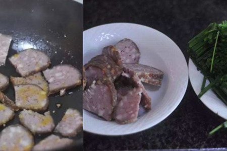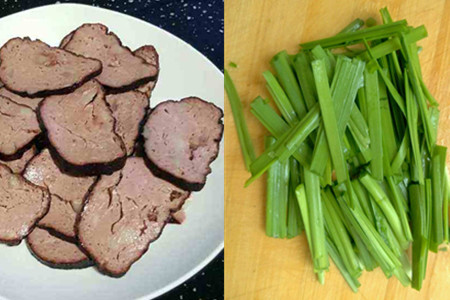 step1、对猪血丸子进行处理,将其切成小片状。(如果猪血丸子的质地很硬,则可以先将其放入水中焖煮,时间控制在五分钟左右,随后再切片)
