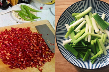 step2、对辣椒和蒜苗进行处理,用清水洗净后,把蒜苗切成小段状,把辣椒全部切成碎末状。
