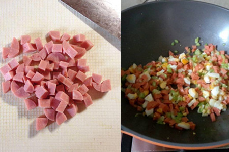 step4、待土豆丁和藕丁都被炒熟之后,加入事先备好的火腿丁,继续翻炒。