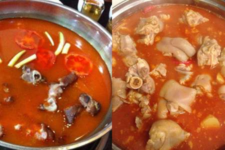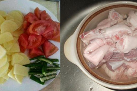 进行食材准备,你需要猪脚、红酸汤、米酸汤、土豆、黄豆芽、西红柿、青蒜、香葱、姜片、料酒等。