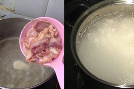 step3、待锅内的大米变得较为软糯时,放入事先备好的猪肉。