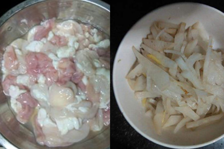 step2、对猪肝进行处理,参照上一步骤进行腌制,同时你需要加入少许姜丝。