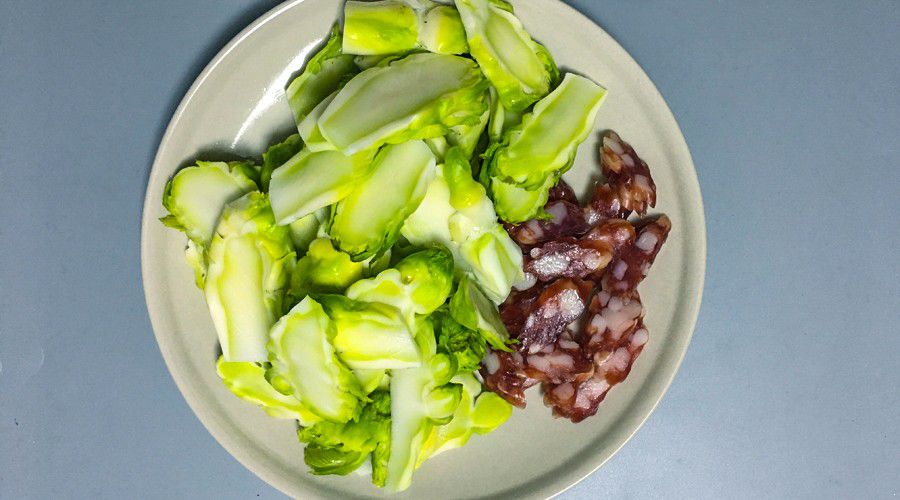 把掰下来的儿菜切成片,腊肠也切成片,准备好姜丝和蒜头,等着下锅。
