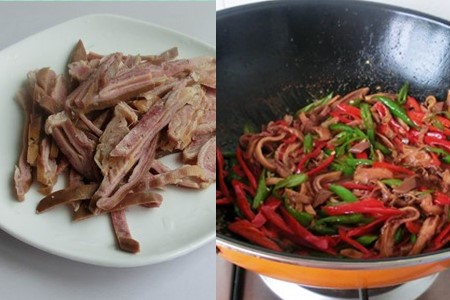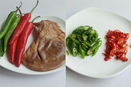 第四步:大概煮一个小时之后把猪肚拿出来晾凉,把猪肚切成丝用盘子装起来,再加入辣椒丝。