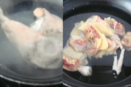 第五步:将鸡肉洗净剁成小块状,放入烧开的水中焯下水(三分钟),然后捞出来用水洗干净。