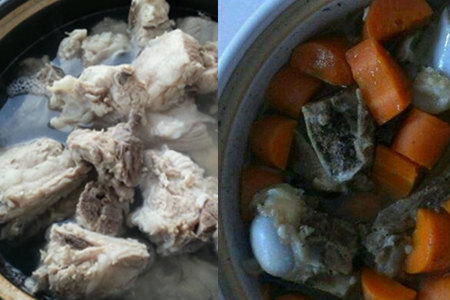 先把猪脊骨等放入砂锅,再放入姜、花椒等调料。胡萝卜比较难煮,也可以一起放进去,因为煮到后面再放可能就煮不出软糯的口感了。盖上盖子,用大火烧开,然后转成小火煲大约1-2个小时左右,可以根据自己的喜好适当缩短或延迟煲汤时间。