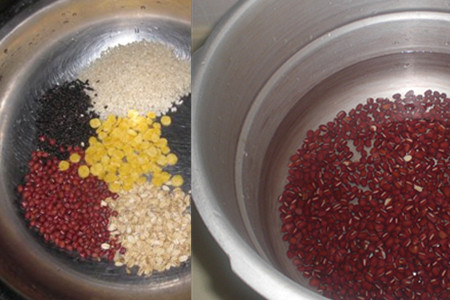 步骤一:你需要准备好红豆、黑米、小米、薏仁,当然你也可以根据自己的需求添加其他食材,比如说红枣或者是枸杞之类的。