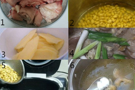 接下来介绍一下黄豆猪脚汤,所需的主料有猪脚和黄豆,辅料有黄酒、大葱和姜以及盐。步骤如下: