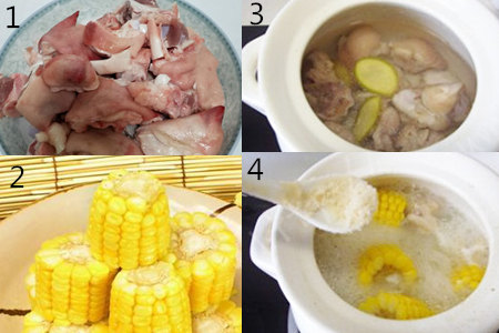 猪脚里面富含蛋白质,可以美容抗衰老,在夏天的时候可以与玉米一起炖汤,这样汤里就会有玉米甜甜的味道;其实,猪脚的常见搭配是黄豆或者花生,炖汤的时候经常会放这些辅料。