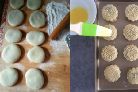 材料:面粉、花生油、鸡蛋、月饼模、莲蓉、咸蛋黄。