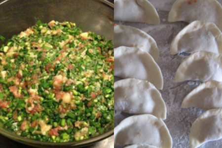 材料:面粉400克、韭菜300克、猪肉250克、花生油40克、酱油一茶匙、蚝油一茶匙、盐3克、五香粉适量。