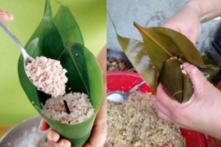第五步,先取一片粽叶,将其卷成像漏斗一样的圆锥形,把少量的糯米放进去,再放腌制好的豆子跟猪肉,猪肉放一块就可以了,然后再放少许糯米,将圆锥形填满。