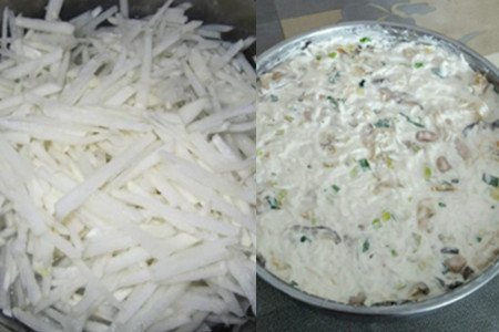 第四步,将粘米粉用水和成浆,往粘米粉浆里面放五香粉和盐,将其搅拌均匀。把萝卜丝和炒好的食材放在一起搅拌。