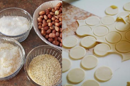 材料:面粉、花生米、白糖、白芝麻、椰蓉、鸡蛋、花生油。