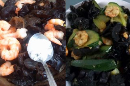 食材:虾仁100克、木耳50克、鸡蛋3只、黄瓜100克、料酒适量、淀粉适量、油适量、盐适量、白糖适量。