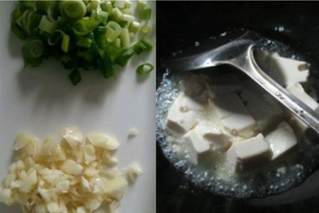 第二步,把水豆腐切开,切成一块块。把葱切成葱花,把姜切成姜粒,把蒜剁成蒜末。