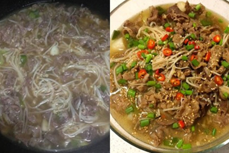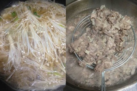 第三步,另起炉灶,在另一个锅中倒入适量的水,煮沸腾后,把解冻后的肥牛放进去,看到肥牛颜色发生变化后立即捞起,将烫好的肥牛加入金针菇的锅中去。