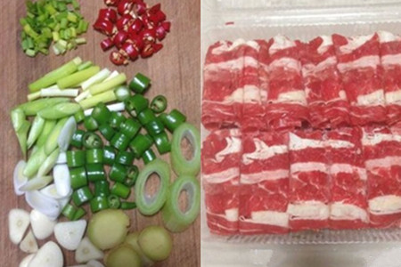 第一步,把冰鲜肥牛从冰箱取出,放置一边解冻;把金针菇的尾部切去,然后将其掰开,用清水洗干净;把辣椒切粒;把葱切成一圈圈;把蒜切片;把姜也切成片。
