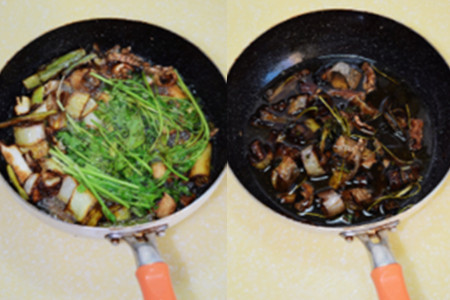 第二步,在干净的锅中倒入500克油,加热,依次把姜片、葱段以及香菜放进锅中熬制,煮到锅中的食材都干枯变色后,把食材捞出来,将剩下的油盛放到一边,以备用。