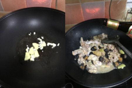 第二步,先把锅热一下,等锅中完全没有多余的水分的时候,倒入适量的油,并加入姜片以及蒜粒,爆香之后把切好的海参和鸡肉一起倒入过,翻炒。