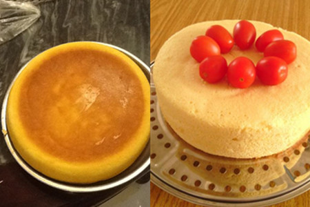 九、拿出一个比电饭煲的内胆略大一点的圆盆碟子,然后把电饭煲倒扣在碟子上,轻扣几下煲底,再慢慢地把它拿起来,一个鲜香诱人的蛋糕就做好了。不过拿电饭煲内胆的时候要注意烫手,穿上防烫的手套会比较好。
