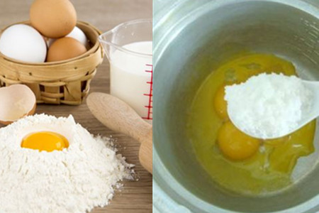 四、取出一个大盆,把蛋黄液放进去,接着放一半蛋白,搅拌在一起的时候要小心一点,尽量不能破坏了蛋白的泡沫状。