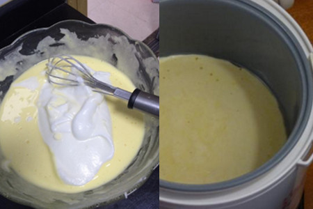 七、大概三分钟之后,一盆蛋糕雏形大概就好了,这时候它是一层黏糊糊的东西。然后把电饭煲洗干净,擦干水分,接着往里面涂一层橄榄油,就可以把蛋糕糊倒进去了。