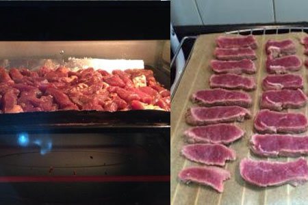 把经过充分晾干的牛肉取下来,平铺在烤盘上,放到烤箱中,打开开关烘烤至少五分钟,注意不能烘烤过度,不然牛肉的口感会很硬,这样就不好吃了。