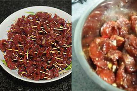 取出冰箱中的牛肉,再次搅拌均匀后,取出准备好的竹签,把牛肉逐块串起,晾起来风干一天。