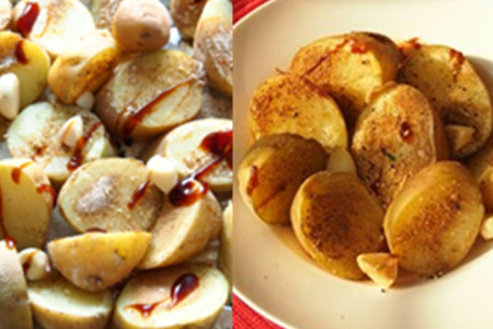 第四步,把蒸好的土豆和蒜头粒放在铺了锡纸的烤盘上,并往其撒上适量的蒜粉,接着倒入适量的蚝油,把烤盘放入烤箱中,将烤箱调到220℃,大约烤13分钟就可以出炉了。