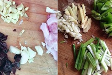 先把干木耳泡开,再加两勺淀粉轻轻抓匀,以为了提高口感;猪里脊肉切片,后把洗净的青椒、香芹切好,葱姜切末。