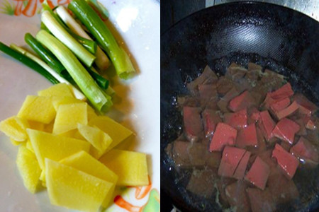 将凝结好的猪血轻轻切成块状,千万不要切碎掉了,然后放入沸腾的开水中煮两分钟左右后捞起来备用。要想把这款粥做好,这一步千万不能省略,因为这样做可以增加猪血的韧度,在煮粥的时候不容易被煮烂。