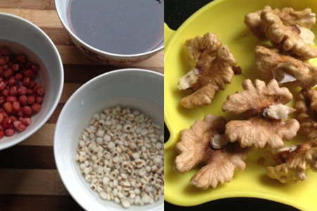 1.将黑米、红豆和薏米提前浸泡一夜。核桃去掉外壳。将除核桃之外的所有食材漂洗干净。